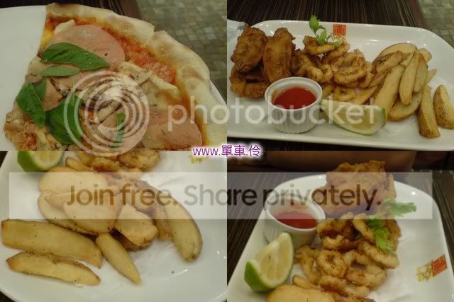我們點了 唐揚香酥三式組合+蕃茄蘑菇火腿起司比薩