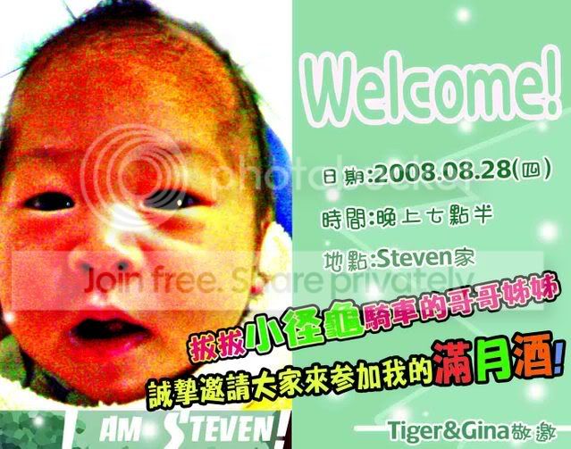 小虎與夫人Tina愛的結晶Steven寶寶 彌月喜 日期:97年08月28日 星期四 晚上 時間:pm7:30至pm10:00地點:Steven 家地址:台中市西區XX路XXX號電話:0919- XXXXXX費用:FREE備註:盡量騎乘小徑車前往.. 會合地點與時間:崇倫公園(美村路+南屯路轉角)pm7:00頭戴安全帽、裝設前後燈、遵守交通龜則有空的參加 參加人員:小伶、小紅鹿一家、小莫、Pingping、韓籍、阿冷、小桃、妮妮、阿哲、...
